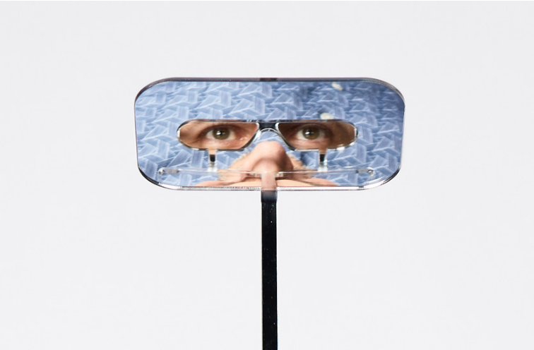 The glasses come with a smaller mirror that is positioned at an angle of 45 degrees towards a large mirror which points to the outside direction.