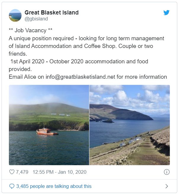 Posting the job ad to social media, the visitor center for Great Blasket Island wrote: “A unique position required – looking for long term management of Island Accommodation and Coffee Shop. Couple or two friends.”