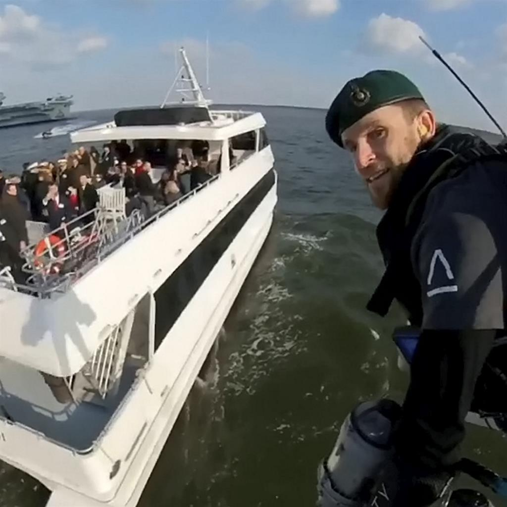 The video of Richard’s flight shows him taking off from HMS Queen Elizabeth, hovering over the ship and going towards the ocean before returning to the ship.
