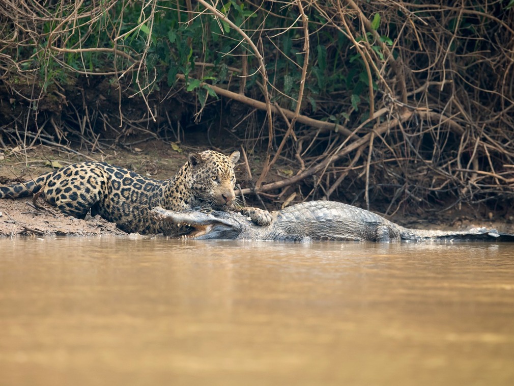 “After a long struggle, she immobilised the giant reptile with the trademark jaguar bite to the back of the skull, and then dragged the huge carcass for over twenty minutes across an open beach into thick cover.