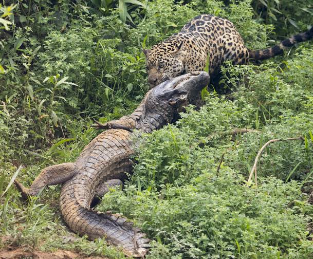 A wildlife photographer Chris Brunskill captured the moment a jaguar and a caiman fought on the Three Brothers River in Mato Grosso, Brazil.