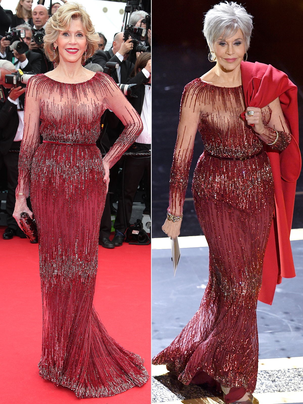 The 82-year-old actress matched a grey pixie haircut, the first one for her so far, with a cardinal red gown that she used earlier in Cannes in 2014.