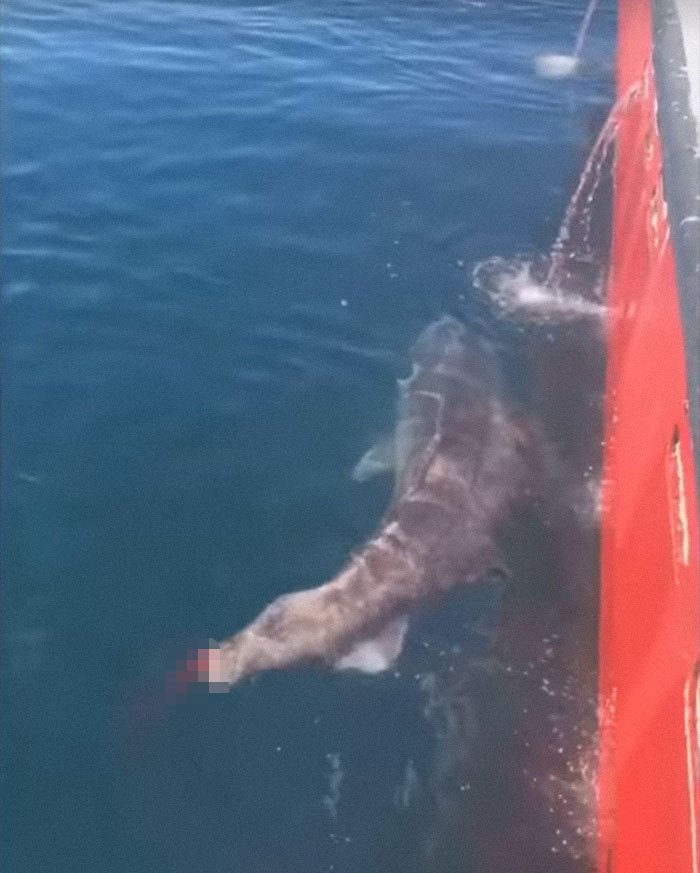 Rather than releasing the shark from their fishing line, the young fishermen decided to torture the animal by hacking off its tail before tossing it back into the sea.