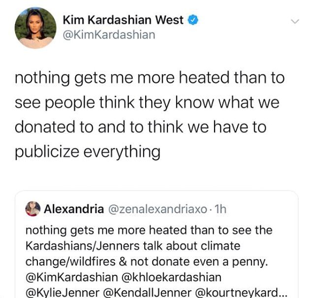 Kim replied: “Nothing gets me more heated than to see people think they know what we donated to and to think we have to publicize everything.”