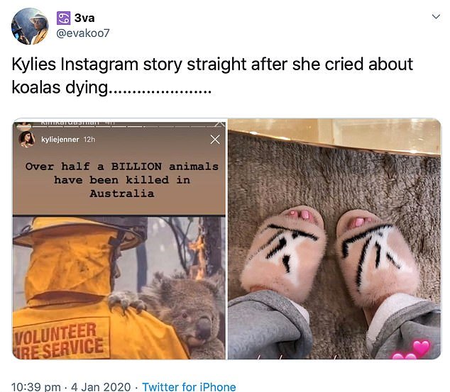 Her one post read ‘this breaks my heart’ below a photo of an injured koala with the text ‘over half a BILLION animals’ being killed by bushfires. Her next photo was ‘baby pink toes’ showing from Louis Vuitton slippers that are made from mink fur.