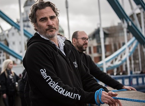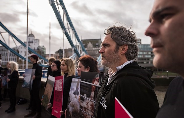 The Joker actor Joaquin Phoenix has tied himself to a bridge as he joined animal rights activists and urged people to go vegan during the protest.