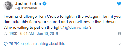 The latest battle between the pop singer Justin Bieber and action star; Scientologist Tom Cruise has taken over the internet. Justin challenged the actor for a fight in the octagon on twitter.