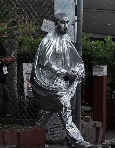 The rapper was wearing a big baggy silver outfit and to match with it he had his entire head painted with silver paint.