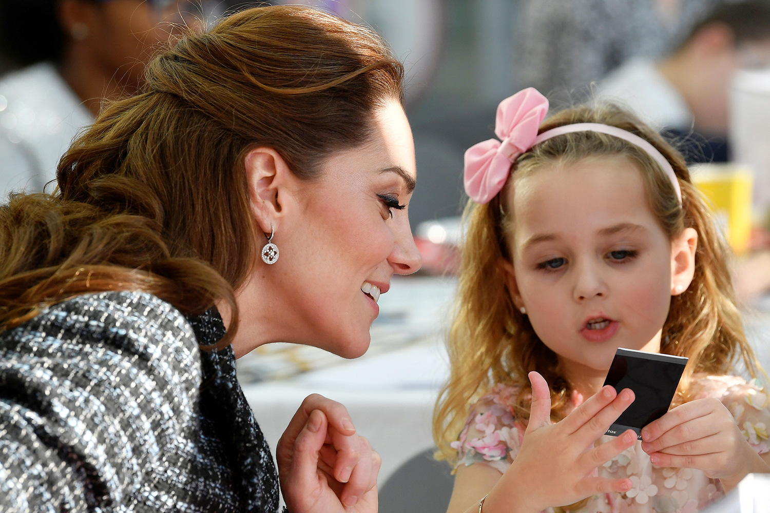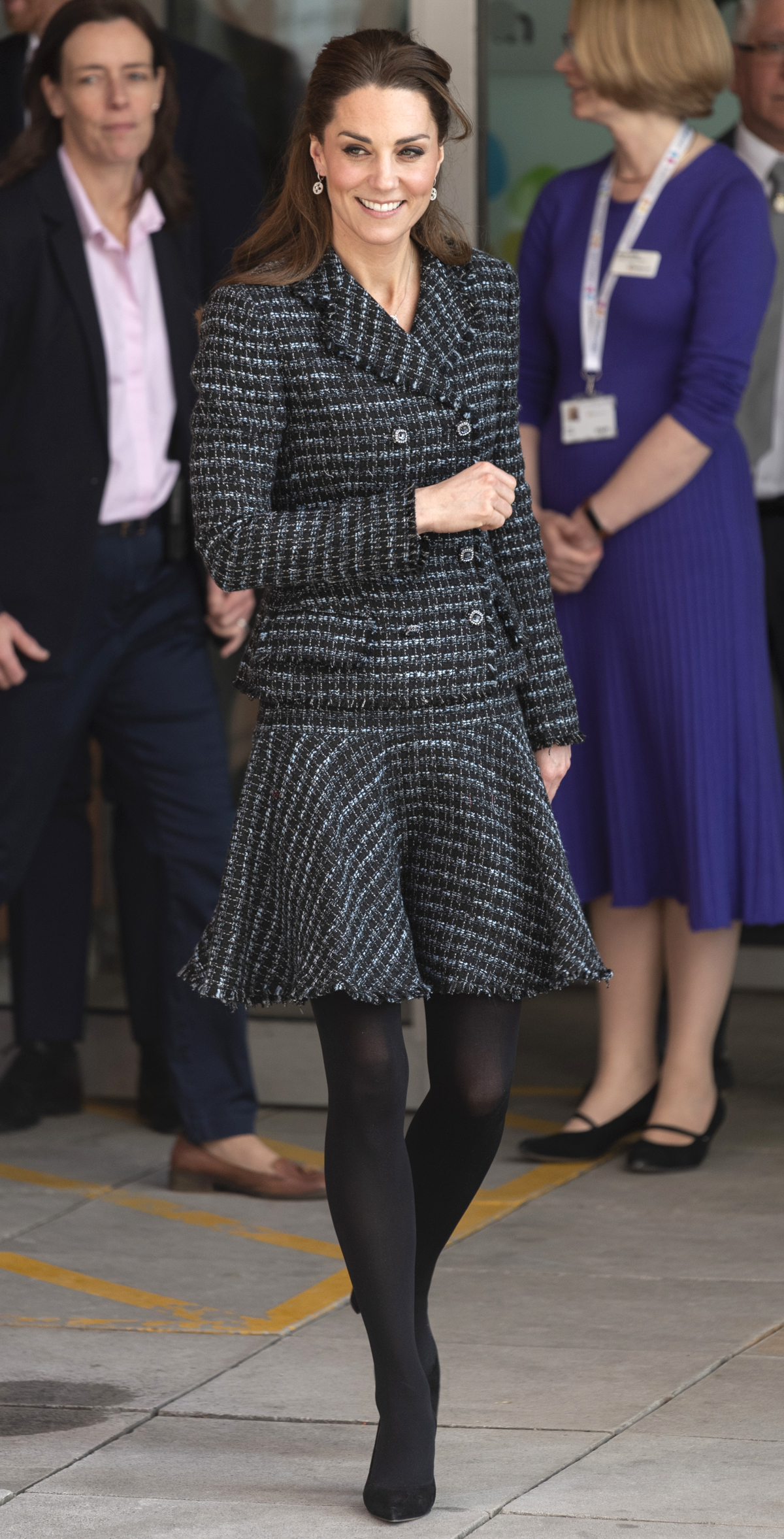 Kate looked fashionable in a Dolce & Gabbana skirt suit paired with black tights and heels. Her half hair was tightly tied back, and she shows off a pair of diamond Mappin & Webb Empress earrings.