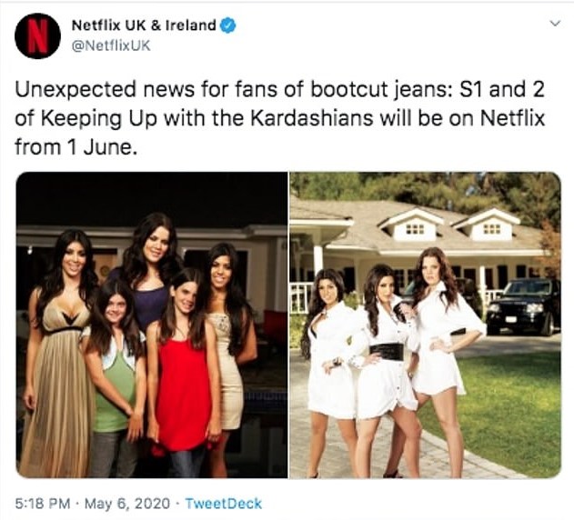 “Unexpected news for fans of bootcut jeans: S1 and 2 of Keeping Up with the Kardashians will be on Netflix from 1 June,” the service platform announced on Twitter, sending KUWTK fans into a frenzy!