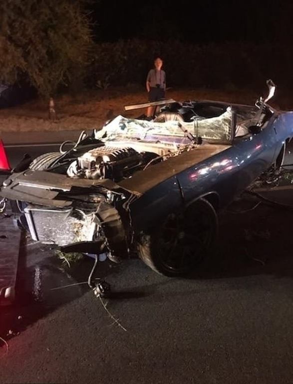 His vintage ‘70s car completely totaled and the top was completely removed with a smashed windshield over a missing hood.