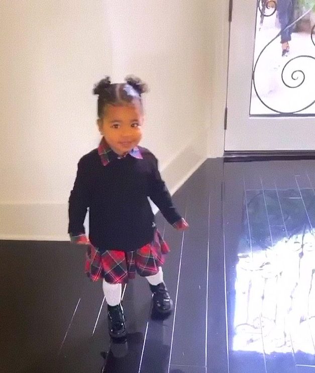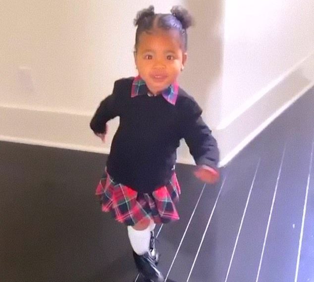 Khloe paired it up with knee socks and black shoes. True was wearing diamond earrings and her hair was worn up in two little buns. She was running around her home with its dark hardwood floors and white walls.