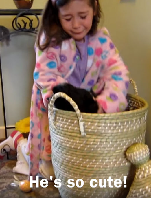 In the second clip, a girl finds a puppy inside a basket, takes the puppy out and holds it in her arms saying, ‘’He is so cute.’’ Then she hugs her mom.