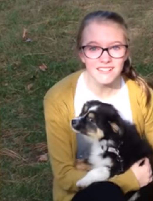 The video starts with a girl coming back from school is surprised to see a cute puppy waiting for her in the yard. She screams ‘’Oh! My God’’ and run to hold her new pup.