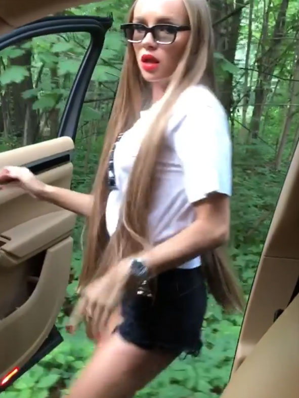 The video shows Tanya dancing in the passenger seat of the car which is driving through a forested area with the door open.