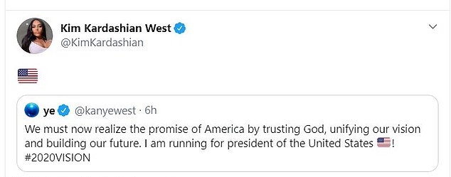 Kim Kardashian retweeted Kanye West’s surprise announcement that he is running for US president this year, showing her full support.