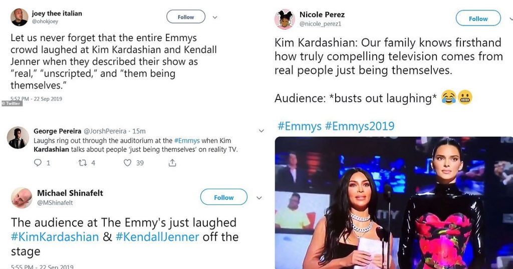 ”Let us never forget that the entire Emmys crowd laughed at Kim Kardashian and Kendall Jenner when they described their show as “real,” “unscripted,” and “them being themselves,” said another.