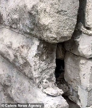 Video footage shows a tiny kitten trapped between two cement walls.