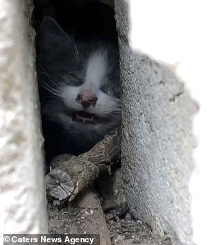 Rescuers broke down a piece of the concrete with a hammer and chisel and rescued the kitten.