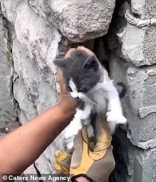 ‘God bless the man who got the kitten out between to walls, safely’ one user wrote.