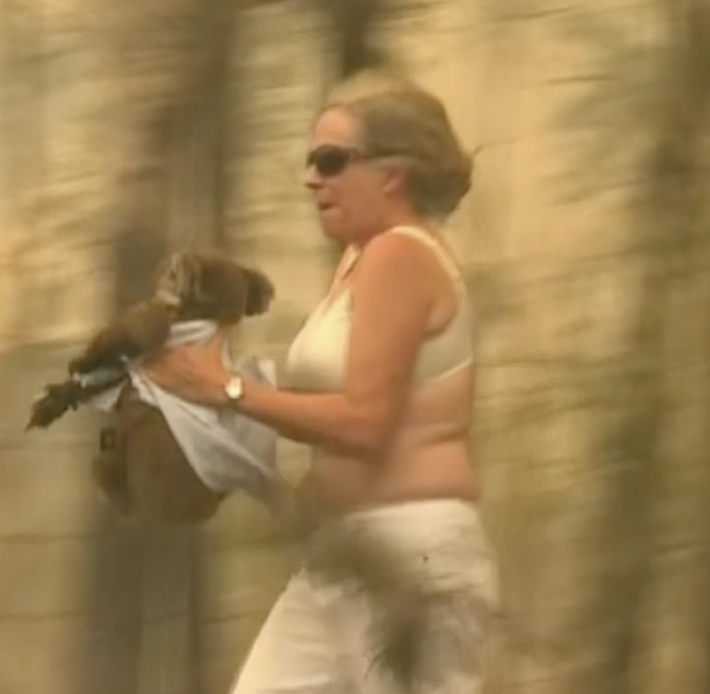 Toni Doherty rushed and took her top off, she then picked the koala up who was burnt and dipped him into the water to take the fire off. She then covered the bear into her top and started running.