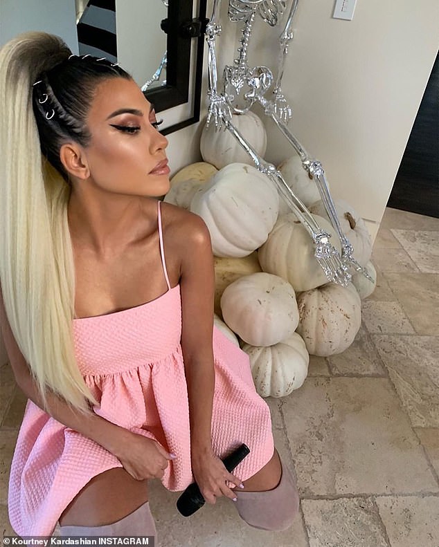 In another picture, Kourtney posed by a corner in her home. It was decorated with bone-colored pumpkins and a silver skeleton on top.