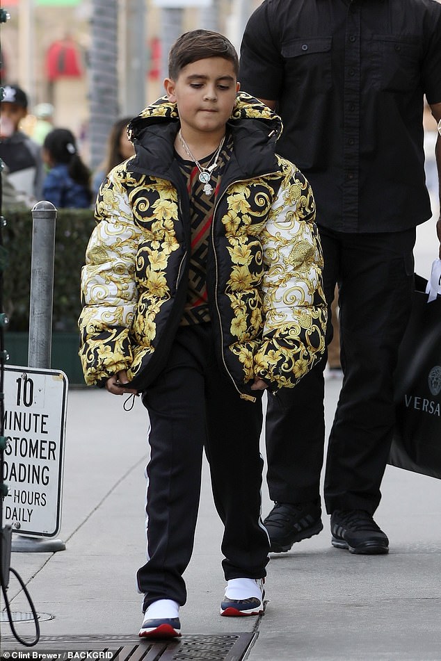 The nine-year-old paired his designer jacket with red, brown and black Fendi shirt along with some black jogging pants with white stripes and red, white and black sneakers.