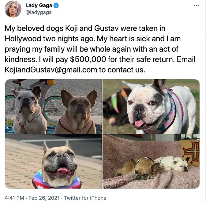Following the dognapping, Gaga, who is currently shooting a new movie in Rome, Italy, offered to pay $500,000 with “no questions asked” upon safe return of her dogs.