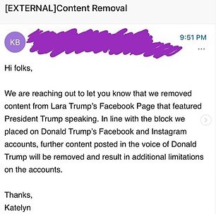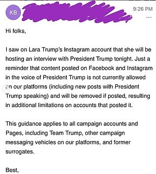 “I saw on Lara Trump’s Instagram account that she will be hosting an interview with President Trump tonight. Just a reminder that content posted on Facebook and Instagram in the voice of President Trump is not currently allowed on our platforms,” the warning read. “and will be removed if posted, resulting in additional limitations on accounts that posted it.”