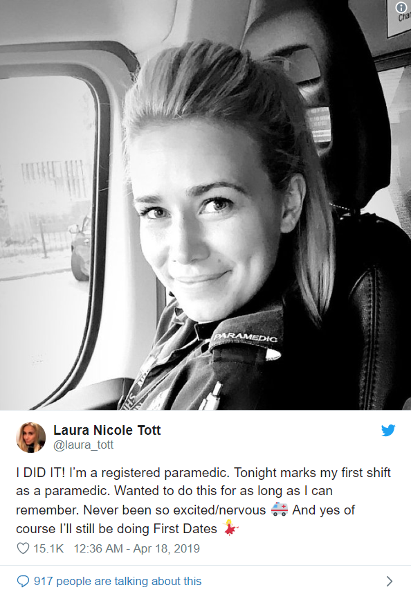 Recently, on Twitter, the First Dates waitress announced that she would be starting with her first shift as a professional paramedic and she also communicated that she would not be leaving her waitress job.