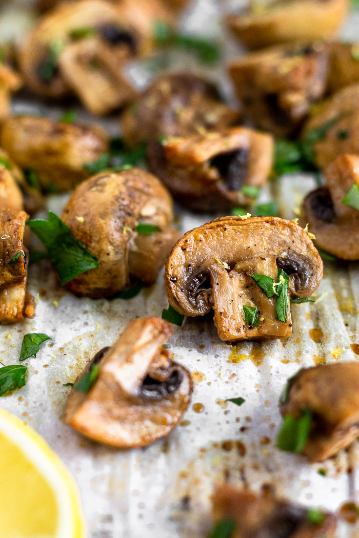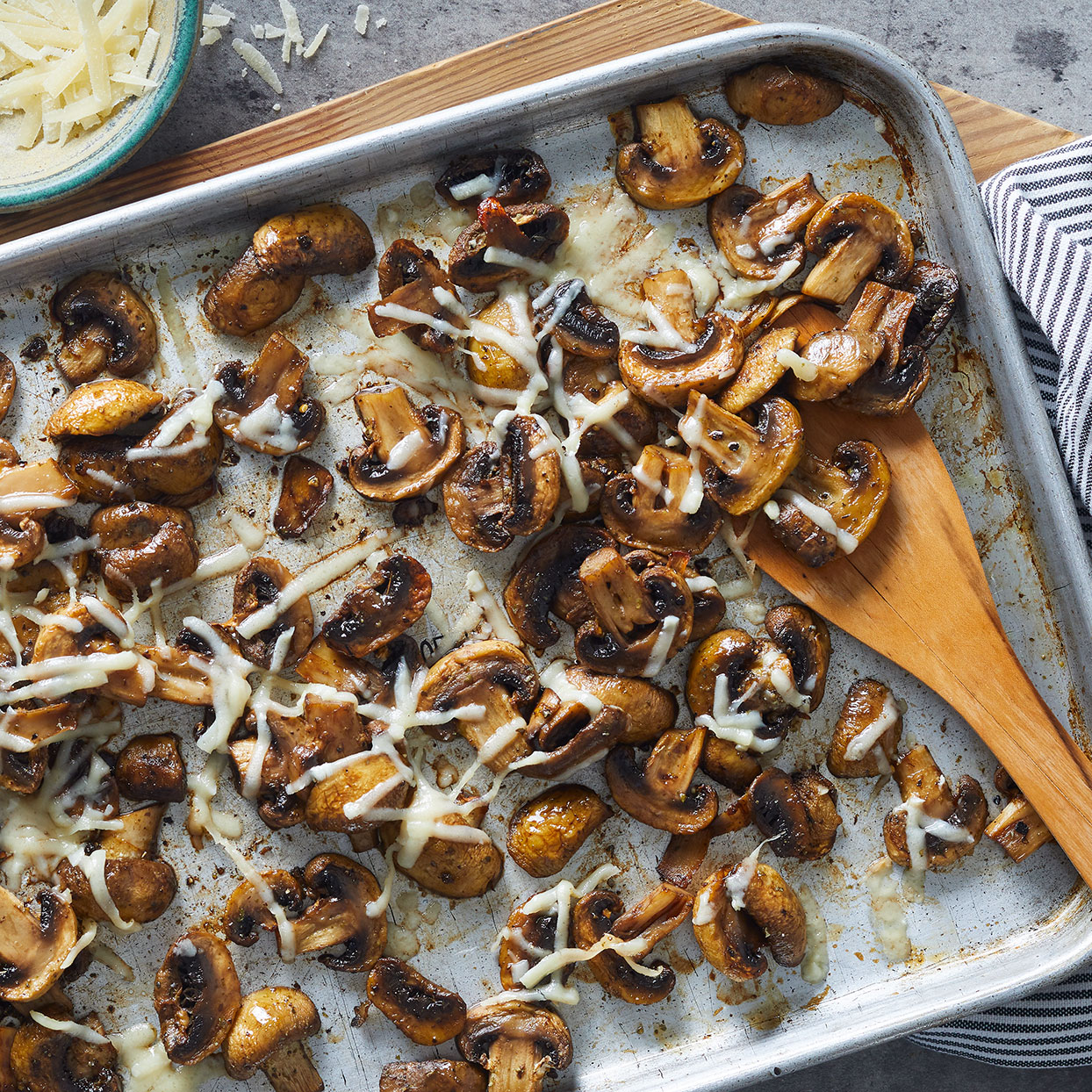 - Take it out of the oven, drizzle balsamic vinegar, and lastly sprinkle some parmesan cheese. Put the tray back in the oven and roast the mushrooms again for five minutes.