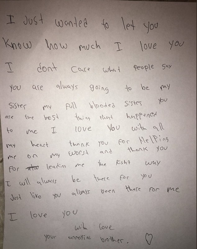 “I just wanted to let you know how much I love you. I don’t care what people say you are always going to be my full-blooded sister, you are the best thing that happened to me.