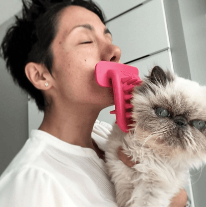 ‘’LICKI is a high-quality, soft silicone brush, designed to feel pleasurable to your cat’s sensitive skin. Gently grasp LICKI’s bite portion with your teeth, slowly approach your cat when she is sleeping or in an otherwise pleasant mood, and ease into the soothing and mutually beneficial licking behavior of cats. Don’t be surprised if your cat licks you back.’’