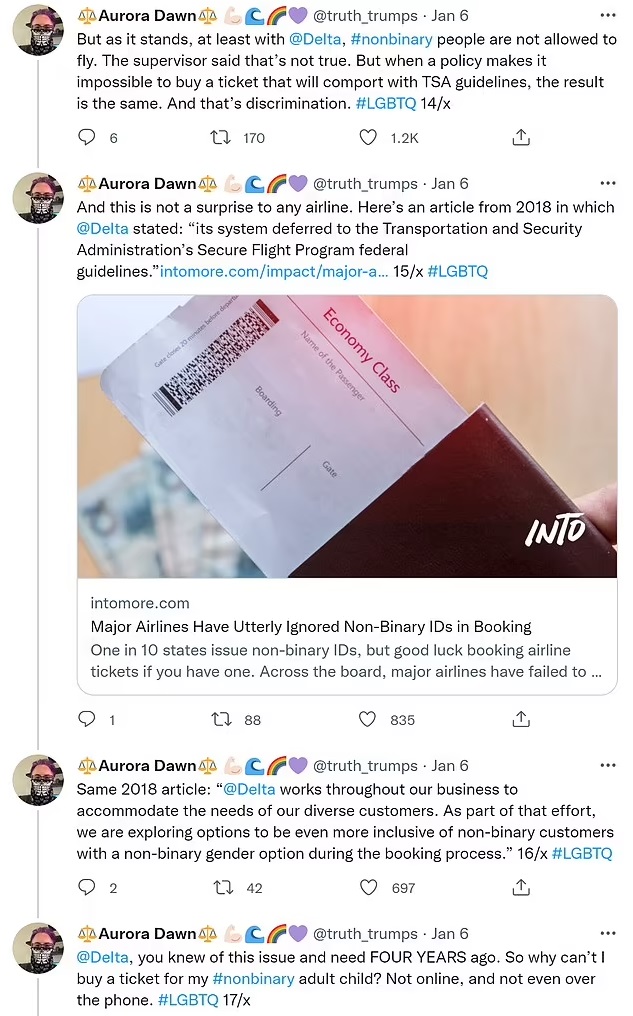 “After some time on hold, a Delta supervisor in Atlanta came on the line and told me that their system only uses male/female and I can only use one of those. I explained again that my adult child is #nonbinary and #LGBTQ and their ID is X and TSA requires them to match.