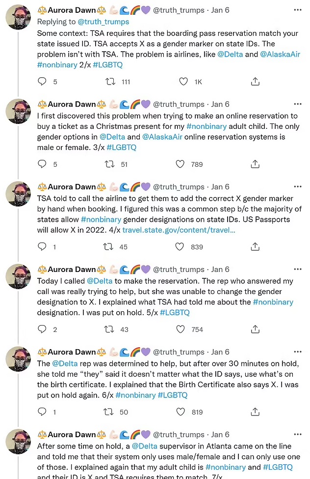 The mother added: “Some context: TSA requires that the boarding pass reservation match your state issued ID. TSA accepts X as a gender marker on state IDs.