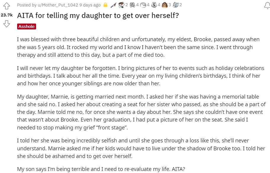 After asking Reddit for advice, people were quick to take Marnie’s side and slam the mother for making unreasonable demands and forcing her children to focus on grief in their special moments even after all those years.