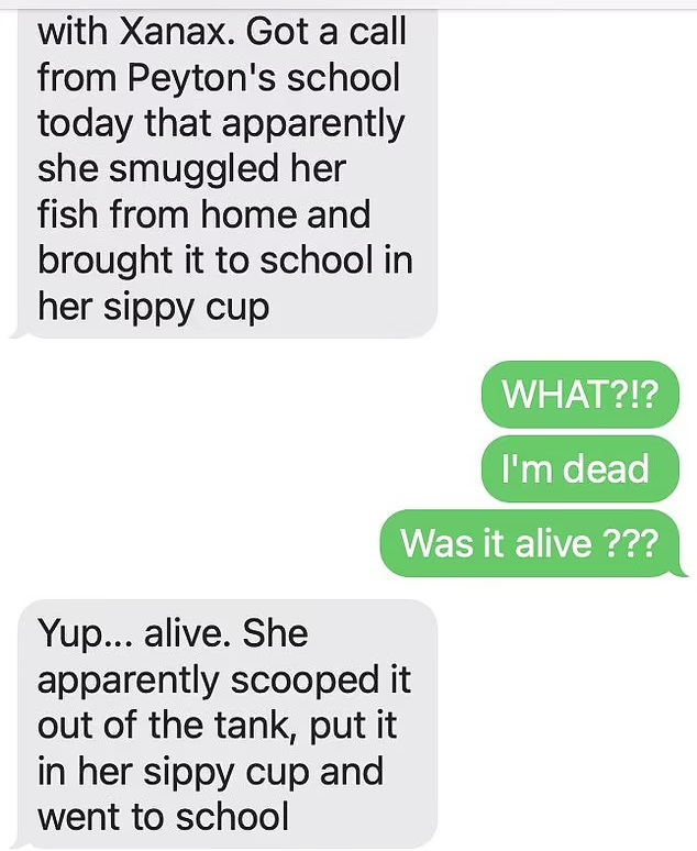 The first message from the mother read: “Got a call from Peyton’s school today that apparently she smuggled her fish from home and brought it to school in her sippy cup.”