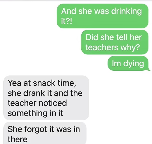 Lauren said in the text messages: “At snack time, she drank it and the teacher noticed something in it. She forgot it was in there.”