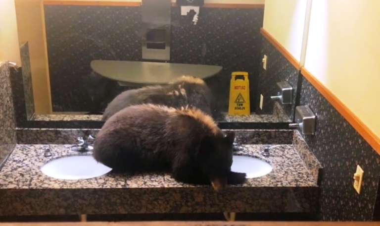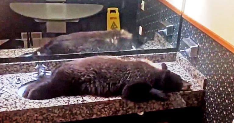 A young black bear was found relaxing on a restroom countertop at a lodge in Montana.