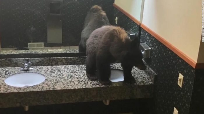 “We heard a bit of a racket in the lobby … Sure enough, the bear had found a window with enough of an opening to get into the ladies’ room by the lobby,” O’Connor said.