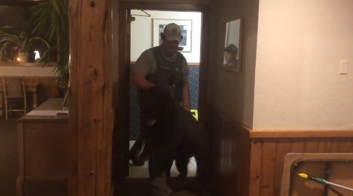 The owner shared a video of the hilarious moment, which shows the Gallatin County Sheriff’s Office and Montana Fish, Wildlife & Parks (FWP) safely taking the animal from the bathroom.