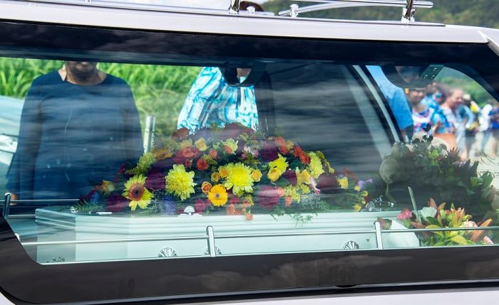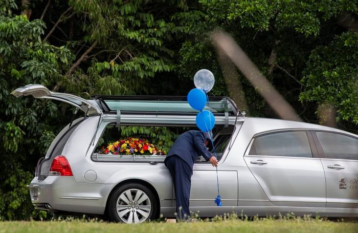Around 500 people came to say their goodbyes to Meeky. His small coffin was decorated with blue balloons and colorful summer flowers.