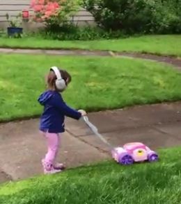Replicating her dad completely, the little girl was ready with her little lawnmower and earmuffs to protect her ears from the loud noise of dad’s mower. Fully geared, she starts following her father’s steps and mowed the entire lawn with him.