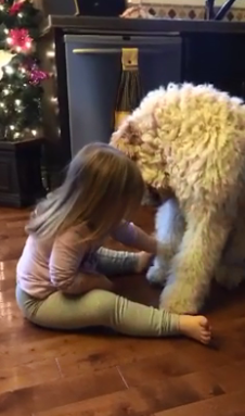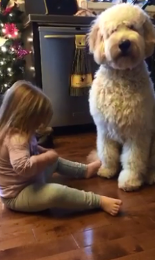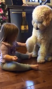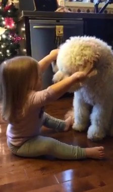 So she teaches him how to shake hands in the most adorable ways. The little girl takes the paw of the dog and shakes it. She then says ‘other paw’ and holds it and then shakes it.