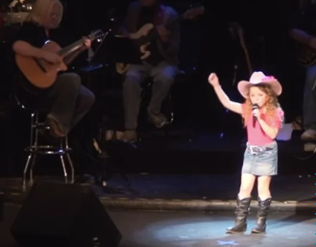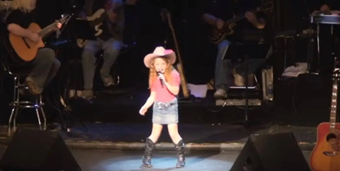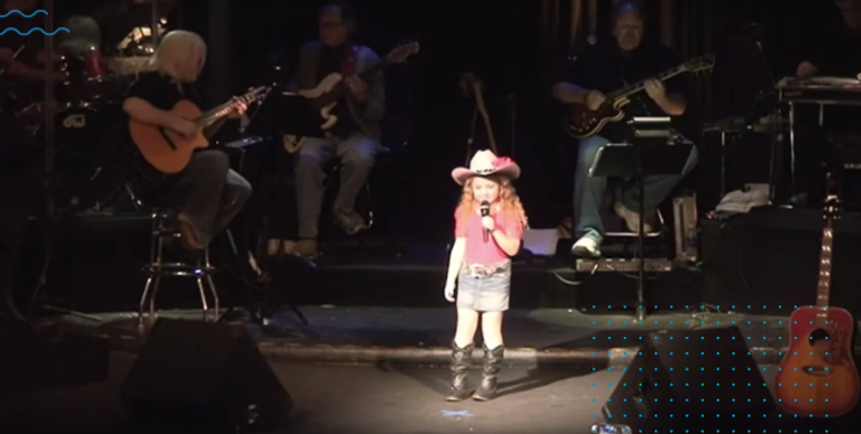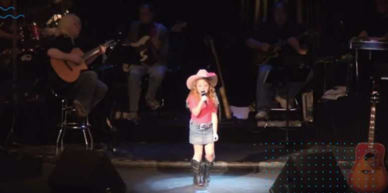 The little girl sang Cowboy Sweetheart in her style at the Centennial Rodeo Opry of Oklahoma Central, and boy, you must see how she was sparkling and confident standing where she stood.