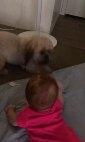 So, the baby kept trying to get hold of the dog and kept giggling whenever he jumped around.