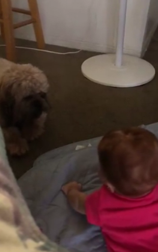 The baby started touching the dog while he kept on moving here and there. The baby was trying to get close to the dog, but the dog kept jumping here and there which is so adorable to watch.