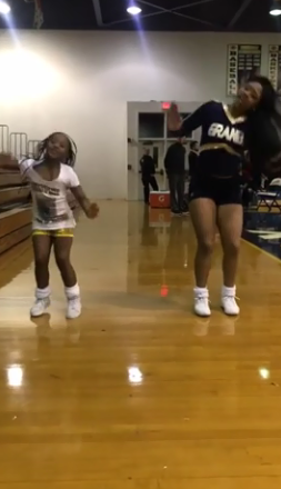 The one-third of the video has her dancing alone, where everyone around is cheering for her. She seems to love cheer-leading as you can spot her smiling. Suddenly her little sister gets up and starts dancing.