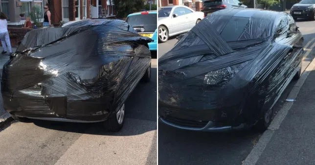 After the car was still parked in front of the house on the following day, the father decided to take matters into his own hands by wrapping the vehicle in black cellophane.