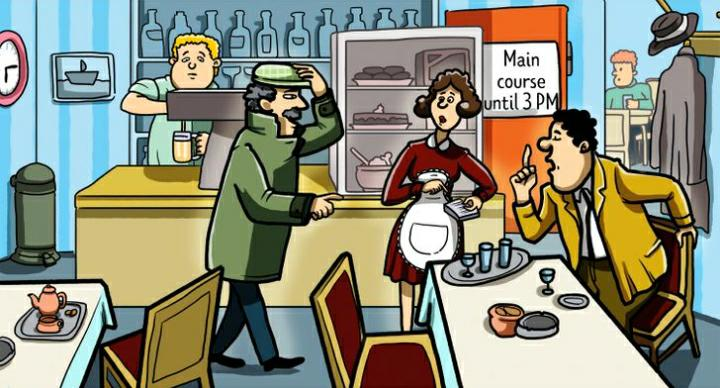 A detective has entered a restaurant and notices two people arguing. The waitress accuses the man of ordering roasted meat but he denies it.